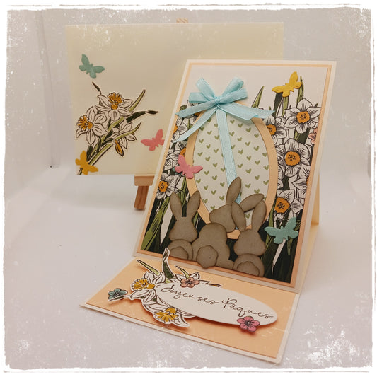 Carte chevalet - Joyeuses Pâques - " Trois lapins dans mon jardin "